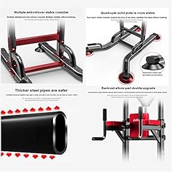 COMFORTABLE& DURABLE :Luxurious appearance and reinforced steel construction of this pull up dip station are going to last for years to come. Thicker back pad, the foam armrest and anti-skid elbow pads can reduce pressure and avoid the injuries. Most important, all the parts neither get slippery when wet nor become loose through extended use.