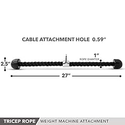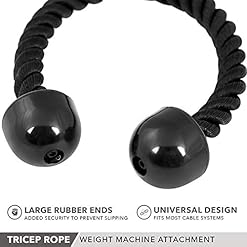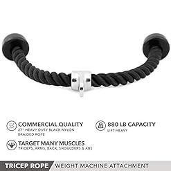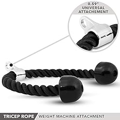 “Strengthen your triceps, biceps, back, shoulders and abs with this Tricep Rope by Day 1 Fitness! This cable gym attachment is made with a heavy-duty, black nylon braided rope that is 27 inches long, and includes a revolving steel attachment for easy performance. It features a 0. 59 inch cable attachment hole, and large rubber ends to prevent slipping. Our tricep pushdown rope supports up to 880 pounds, making it perfect for beginner and experienced weightlifters. It is designed to fit all cable systems in personal home gyms, sports and fitness clubs, and pro gyms. This is a commercial-quality piece of gym equipment that is extremely durable, and will develop muscles and body mass. Made to improve your grip strength, our tricep pressdown rope features an easy, non-slip grip that will be comfortable while exercising. You will be able to conveniently use lat and ab machines, and cable crossover machines to maximize your workout routine. At Day 1 Fitness, we believe in providing you with the best equipment so you can achieve your exercise and weight loss goals. Product Details: (1) Tricep Rope with 0. 59” cable attachment hole, Materials: Nylon Braided Rope, Steel, Rubber, Size of Rope: 27” long, 1” diameter, Size of Stoppers: 2 ½” diameter, Weight: 1. 55 lbs, Color: Black, Supports up to 880 lbs”