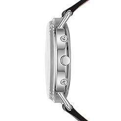 Round stainless steel case, with a gray dial. Black, leather band.