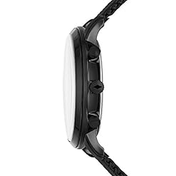 Round stainless steel case, with a black dial. 44mm case, 22mm band width, hardened mineral crystal lens, Quartz movement with chronograph analog display, imported.