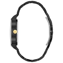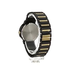 screw-back case, black and gold-tone bracelet with deployant closure, and water resistance to 30 meters.