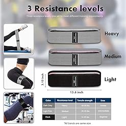 Our cotton workout bands come in a pack of 3 with different levels of resistance: Light-Medium-Heavy.They are color-coded from dark grey having the least level,pink having the medium level and black having the strongest level.Different levels of intensity and different strengths will provide you with more flexibility and more options for your exercise routine,targeting specific muscle groups like legs, thighs, hip or glutes.