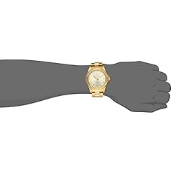 Gold dial with gold tone and white hands and gold tone roman numerals; luminous; textured bezel; mineral crystal; 18k gold ion-plated stainless steel case and bracelet