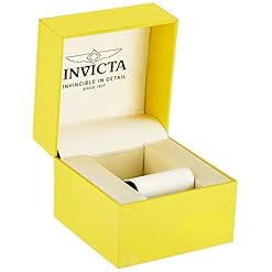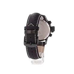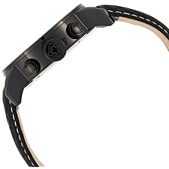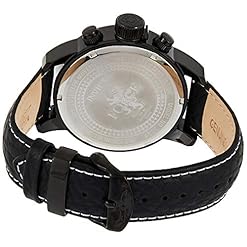 Lefties will appreciate this retro-styled black Invicta stainless steel chronograph for men, which features the push button controls on the left side of the case. This large, round black-plated stainless steel watch case features a thin bezel that frames a black dial face with interior tachymeter markings. It also offers three chronograph subdials–small seconds, 60-minute timer, and 24-hour register–full Arabic numeral display, large Tritnite luminous hands (with yellow seconds hand), and a date window at 4 o’clock. It’s completed by a supple black leather strap with white contrast stitching. Other features include a scratch-resistant mineral crystal with anti-reflective coating, precise Swiss quartz movement, and water resistance to 100 meters (330 feet).