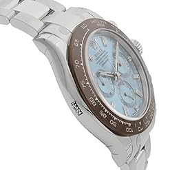 Rolex Cosmograph Daytona Platinum chronograph men’s watch equipped with Swiss-made calibre 4130 automatic movement. The 40mm platinum case and bezel with chestnut brown cerachrom insert features an ice blue dial with chestnut brown counters and scratch-resistant sapphire crystal. Minute markers located on outer rim. Chronograph function includes three sub-dials displaying 12 hours, 30 minutes and 60 seconds. Other functions include hours, minutes and seconds. The strap is made of platinum with platinum folding buckle. This watch is water resistant to 10ATM (100m or 330 feet) and has a power reserve of 72 hours.