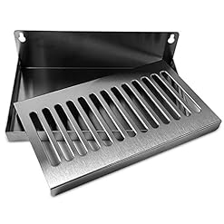 This tray mounts to a wall/fridge door under your beer faucets or to the door of your kegerator. Made of high grade 304 sanitary stainless steel in the USA. Includes tray with backsplash and removable, easy to clean grate. Lift tray off mounting screws for easy cleaning. NO drain. Dimensions: 14″L x 6″W x 3″H.