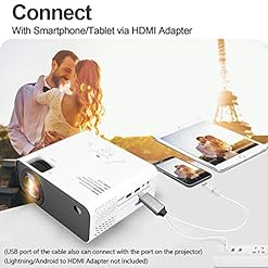 【Mini Projector for Cellphone】Connect with iPhone smartphones need a Lighting to HDMI adapter cable,the HDMI port connects the projector,and at the same time the USB port connect with the USB port(a cable needs 3 ports),the Android smartphone needs a USB/Type-C to HDMI cable(a cable needs 3 ports),the connect ways similar to iPhone smartphone