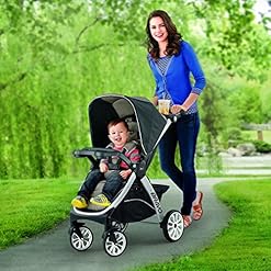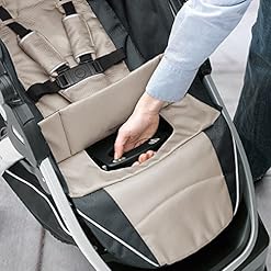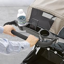 Full suspension and front swivels make it easy to maintain a smooth ride in every configuration. One-touch brakes keep the stroller in place when parked. A height-adjustable handle, parent tray with two cup holders, and large storage basket provide added convenience for mom or dad.