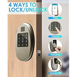 【MULTIPLE WAYS TO UNLOCK】: Advanced 4-in-1 entry Deadbolt, Code + Smartphone + Key + Fob. Requires 4 * AAA batteries, the front keypad come with a USB charging port, you could temporary charging the entry door lock.