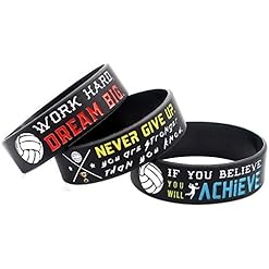 This wholesale bulk pack of 1 dozen volleyball wristbands includes an assortment of 3 unique designs with motivational quotes. These inspiring sports bands serve a dual purpose: they are fun and stylish to wear, and they also spread a positive message! Use these silicone rubber volleyball bracelets as party favors and goodie bag items at your next volleyball tournament or volleyball theme birthday party. These versatile and keep-worthy volleyball gifts can be worn by volleyball fans and players, parents and coaches. If you’re a volleyball mom or volleyball dad, you can give these away to your son or daughter’s volleyball team at their next big game, to boost morale and team spirit. These encouraging quotes will remind them to work hard and push their limits, and they can achieve anything they set their minds to. Each 12-pack of wrist bands contains 4 pieces each of the following designs: Work Hard Dream Big, Never Give Up, and Believe to Achieve. These volleyball themed bracelets are embellished with bold colors and volleyball graphics, and come in unisex colors for him or her. They will enhance any volleyball uniform and promote team spirit and unity. An updated alternative to traditional sports medals, trophies and certificates, these hip and trendy wrist bands can be given out as volleyball league awards and achievement gifts. These one-size-fits-most wristbands measure approximately .75″ wide, and 8 inches around, and fit on most tween and teen boys and girls, and adult men and women.