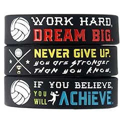 Pack of 12 volleyball silicone rubber wristbands with motivational quotes that will inspire volleyball players, fans and coaches.