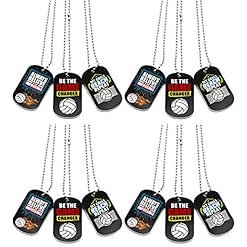 Pack of 12 volleyball dog tag necklaces with motivational sports quotes about confidence, determination and dedication.