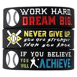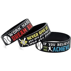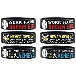 This bulk pack of 6 baseball silicone rubber wristbands includes an assortment of 3 unique styles with motivational sports quotes: Work Hard Dream Big, Never Give Up, and Believe to Achieve. These stylish, trendy baseball bracelets are useful as coaching tools and supplies, for teambuilding exercises and for teaching character, hard work and determination. An updated, modern alternative to certificates, medals, and trophies, these cool wristbands feature positive inspirational slogans and sayings. Baseball moms, dads and coaches can give these wrist bands away as gifts for their baseball team, as achievement awards and performance incentives. They will compliment any baseball outfit or baseball team uniform. Conveniently packaged in a bulk 6-pack, these inspirational quote bracelets make easy gifts for baseball lovers and baseball players, and party favors for guests at any baseball themed birthday party or team celebration. Hand them out at baseball games, pep rallies, and tailgating parties to fans and supporters of your team. These one-size-fits-most wristbands fit on most tween youth and teen boys and girls, and on adult men and women. Each wrist band measures approximately .75 inches wide, and 8 inches around. These unisex wrist bands come in black color with multi-colored accents, and are suitable for both him and her.