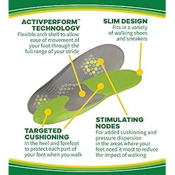 Dr. Scholl’s Fitness Walking are insoles that offer: ActivPerform technology that reduces shock in your feet, joints and lower back against stress and strain while you walk. Superior cushioning that helps reduce muscle fatigue in your feet and legs so you can walk longer with greater comfort. Heel & arch support and a flexible toe bed to protect each part of your foot through the full range of your stride. Stimulating nodes for added responsiveness while walking. Slim design that fits in and enhances a variety of walking shoes and sneakers. The package contains one pair of insoles to fit men’s shoe sizes 8-14.