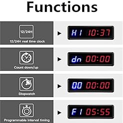 Multi-function timer – The gym training timer has 5 different modes (Normal time mode, Interval timer mode, Countdown mode, count-up mode and stopwatch mode). Normal time with 12 and 24 hours in hours and minutes. Count down/up in minutes and seconds. Interval mode in minutes and seconds; Stopwatch counts up to 99 minutes, 59 seconds and hundredths of seconds.