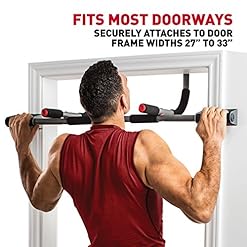 The Perfect Fitness Multi-Gym is a portable gym system that can be used as a doorway pull up bar or on the floor for situps, pushups and dips. All Perfect Fitness Multi-Gyms target arms, chest, core and back muscles with workouts that ensure maximum muscle engagement. Featuring padded handles that provide three grip positions to perform normal grip, wide grip, and hammer grip pullups (compact Sport model has two grip positions for normal or hammer grip pullups), the bar has a 300-pound capacity making it safe to use with a weight vest. When turned over, the Multi-Gym can be used on the floor to perform situps, pushups and dips; padded handles offer comfort and help to ensure correct form. Multi-Gym Sport, Pro, and Elite feature patented door frame guards that use a unique flat design with thick foam pads to help protect doorframes. All Multi-Gyms are easy to install and do not require any drilling. Width is adjustable (Pro model also adjusts for height): Multi-Gym Elite and Pro securely fit door frames up to 33 inches wide and up to 6 inches deep; Multi-Gym Sport securely fits door frames 27 – 35 inches wide. Assembled dimensions: Sport measures 11 x 36.5 x 12 inches, weighs 4.8 pounds; Pro measures 15 x 38 x 14 inches, weighs 6.2 pounds; Elite measures 15 x 38 x 14 inches, weighs 8 pounds. Manufacturer’s one-year warranty.