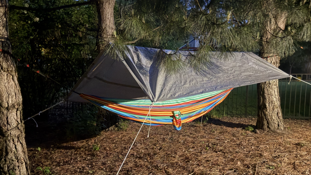 By then it was early evening, and I was feeling decidedly cranky about the whole endeavor. Even with a ton of outdoors confidence and relatively low standards for comfort, I’d still put in a few hours’ effort and over 60 bucks for my supposedly free and easy campout. Plus, the weather was gray, the kind of endless drizzle that seems to come from nowhere and seep into everything all at once. Sleeping in storms is one thing in an expedition, but leaving a plush guest bed for a damp suburban yard felt entirely less enticing. Anticipating a stiff and soggy night, I trudged to the far corner of the yard to hang the hammock and pitch a quick rain fly. The tarp’s tie-downs would be at a better angle if I tied them to the shared picket fence, but that seemed like a provocation.