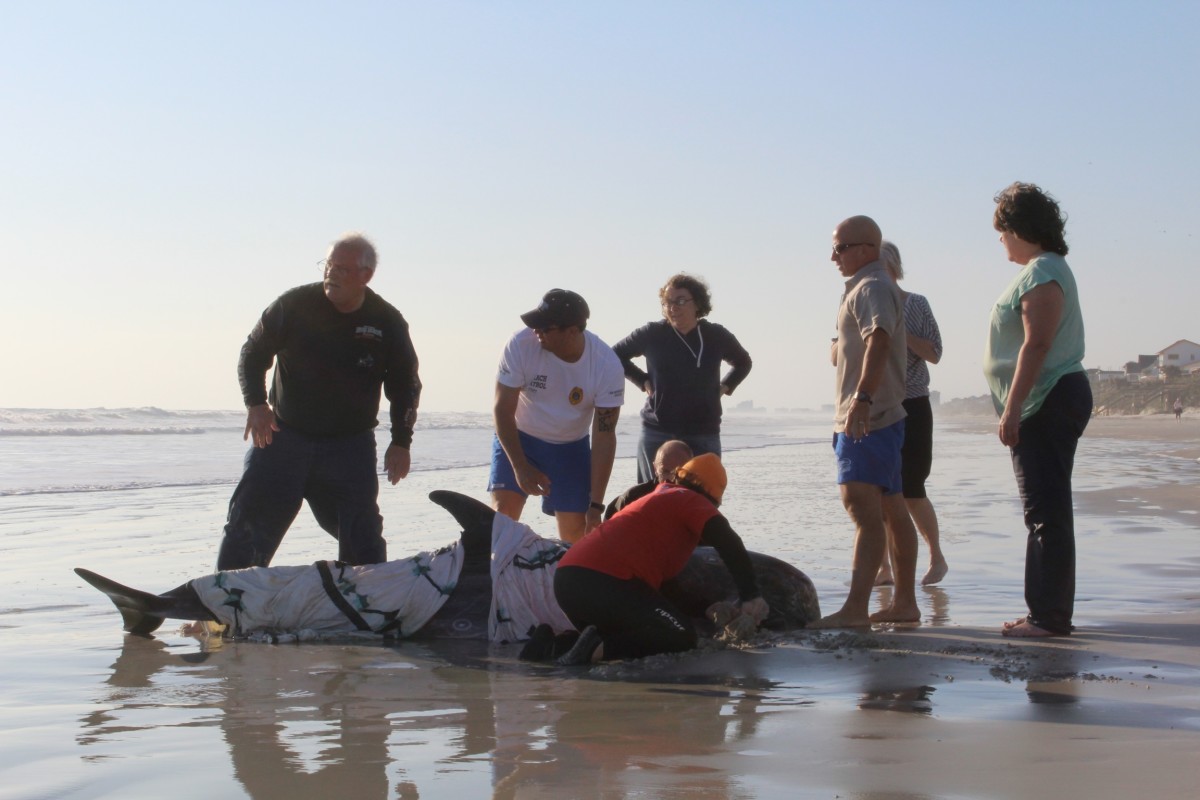 Rescue personnel and experts rush to examine and assist a live dolphin amid an ongoing surge of strandings along the coast.