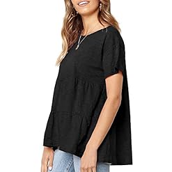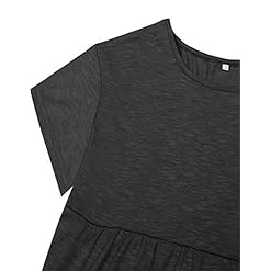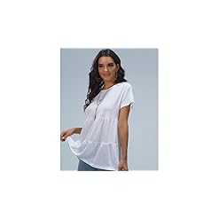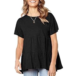 Features: Summer short sleeve round neck t-shirt. Loose style! Flared hem and pleated ruffles high low design. The high low hems will add some elegant and stylish touch to your everyday look. Babydoll blouse top. Short sleeve, o neck, badydoll, peplum blouse.