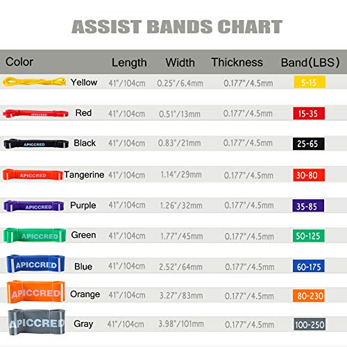 WHAT ARE THE USE OF THE BANDS: APICCRED exercise band fits not only the muscle exerciese like chin-ups, pull-ups, resistance training but also suitable for flexibility training such as yoga, pilates, aerobics and more.