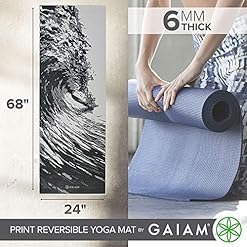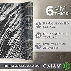 Durable and chic, Gaiam’s Premium Print Reversible Yoga Mats provide a stable, sticky, non-slip 5/6mm cushioned surface for your yoga practice. Perfect for home or studio use, this mat ensures the safety and comfort you need to enhance proper alignment and maintain poses and the additional cushioning helps to protect joints. Manufactured free of the top six most harmful phthalates, this mat is a healthier choice for both you and the planet! Please note a packaging change from 5mm or 6mm, but rest assured it is the same size and style mat, just in new and improved packaging. Also, printed yoga mats may release a harmless odor when first unwrapped. For best results unroll and air out your mat for 2-3 days before use.
