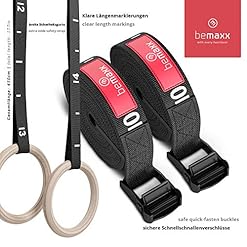 ? HIGH-STRENGTH, EXTRA-WIDE SAFETY STRAP WITH CLEAR LENGTH MARKKINGS – Our premium 14.76ft (4.5m) long x 1.5inches (3.8cm) wide safety strap with handy markings and quick-fasten buckles let you adjust your gym rings to the same length in an instant.