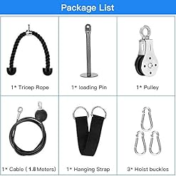 【Package Including】1*Tricep Rope,1*Loading Pin,1*Slient Metal Pulley,1*1.8M/70.87IN cable,1*Hanging Strap,3*Hoist buckles.