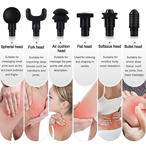 【30 SPEED ADJUSTMENT& 6 MASSAGE HEAD】The percussion massage gun with 30 Levels of intensity , supports 400-3500 beats per minute,you can easily find the vibration amplitude that suits you best .Massager is equipped with 6 different shaped massage heads to help the user to relax different body parts