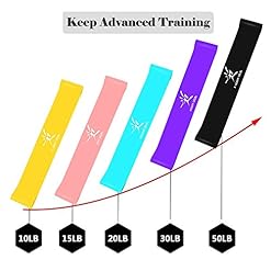 5 Color-coded Bands Included – Yellow (10 lbs), Red (15 lbs), Blue (20lbs),Purple (30 lbs), Black (50 lbs).