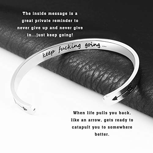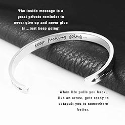 【POWERFUL & ELEGANT DESIGN】This inspirational cuff bracelet with message safely hidden on the inside for your knowledge only. It’s great private reminder to never give up and never give in…just keep going! The arrows on the bracelet that reminds you that when life pulls you back, like an arrow, sometimes it’s just getting ready to catapult you to somewhere better, and gives you peace of mind whenever and wherever you wear the motivational bracelet. It’s an absolutely powerful piece of jewelry.
