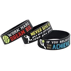 Included in this 6-pack are 3 unique styles of tennis bracelets (2 pieces of each): Work Hard Dream Big, Never Give Up, and Believe to Achieve.