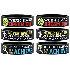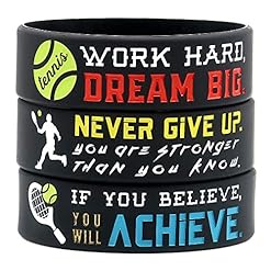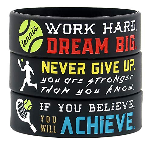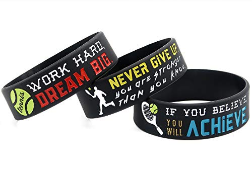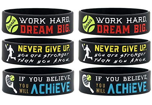 This bulk pack of 6 tennis silicone rubber wristbands includes an assortment of 3 unique styles with motivational sports quotes: Work Hard Dream Big, Never Give Up, and Believe to Achieve. These stylish, trendy tennis bracelets are useful as coaching tools and supplies, for teambuilding exercises and for teaching character, hard work and determination. An updated, modern alternative to certificates, medals, and trophies, these cool wristbands feature positive inspirational slogans and sayings. Tennis moms, dads and coaches can give these wrist bands away as gifts for their tennis team, as achievement awards and performance incentives. They will compliment any tennis outfit or tennis team uniform. Conveniently packaged in a bulk 6-pack, these inspirational quote bracelets make easy gifts for tennis players and tennis lovers, and party favors for guests at any tennis themed birthday party or team celebration. Hand them out at tennis games and tournaments, to fans and supporters of your team or of your favorite tennis player. These one-size-fits-most wristbands fit on most tween youth and teen boys and girls, and adult men and women. Each wrist band measures approximately .75 inches wide, and 8 inches around. These unisex wrist bands come in black color with multi-colored accents, and are suitable for both him and her.