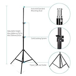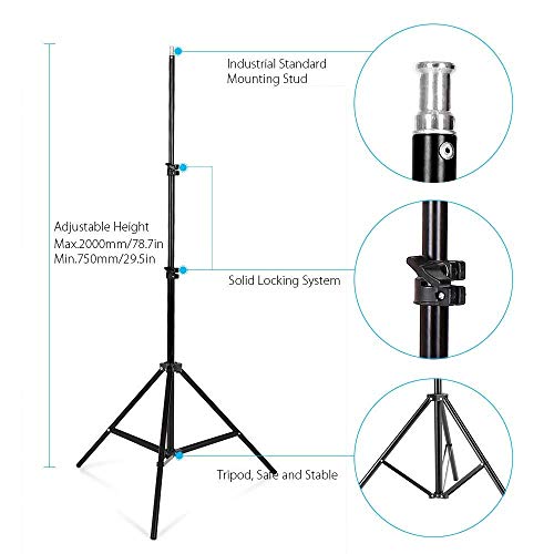 ?Light stand is made of aluminum alloy, very durable. Its working height can be easily adjusted. Max. height is up to 2m(78.7inch). Cantilever stick is adjustable from 29.5inch to 54.7inch, coming with sandbag for balance, also it can be added some other heavy objects to make it more stable. They are all ¼ screw and compatible with all major photo equipment including reflector umbrella, softboxes, backgrounds and more, lightweight and portable