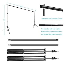 This backdrop support system is lightweight, heavy-duty and extensible for almost any application, Height is adjustable from 2.6 ft to 7 ft. Width is adjustable from 5 ft to 10 ft.