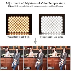 Bi-color Dimmable LED Video Light: 96pcs(3300K)/96pcs(5600K) SMD lamp beads make for the perfect lighting source. 3300K (Yellow )-5600K (White) Bi-color, brightness adjustment (20%-100% ) to suit multiple shooting situations. Max. Brightness: 2500LM. Power: 30W