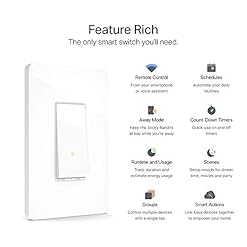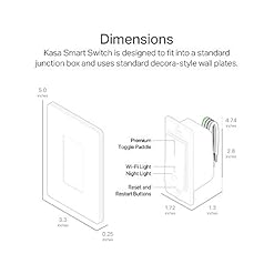 Control your lights, ceiling fans, and other fixtures from anywhere with the Kasa Smart Wi Fi Light Switch. The smart switch replaces any standard light switch, and connects to your home Wi Fi in no time through the free Kasa app. Kasa also lets you manage connected fixtures with your smartphone or tablet, including setting schedules, timers and countdowns. For added convenience, you can use your voice to control when paired with Amazon Alexa, Google assistant and Microsoft Cortana. Protocols supported: IEEE 802.11b/g/n; System requirement: Android 4.1 or higher iOS 9.0 or higher; Wireless type: 2.4GHz 1T1R.