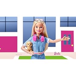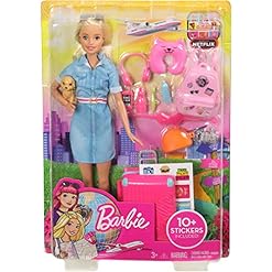 Barbie doll can take her puppy, and young dreamers, around the world with this travel-themed set. Inspired by Barbie Dreamhouse Adventures, it comes with so many pieces to help imaginations take off -peek into the everyday life of Barbie as she embarks on exciting adventures with her family and friends! Barbie doll has her puppy as a traveling companion and a pink suitcase that opens and closes -it even has a collapsing handle, just like real luggage! Plus, the travel set includes a sheet of stickers that can be used to decorate the suitcase and document her travels. Fill her suitcase and her pink backpack (already decorated) with travel necessities like a cell phone, eye mask, neck pillow and headphones. Freshen Barbie doll up at arrival with a toothbrush and toothpaste that fit into her makeup bag. Then put on her sunglasses and head out to capture the sights with her camera. She’s ready for adventure in a denim shirtdress with belt detail and trendy sneakers. Curious travelers will love taking her places near and far, letting their minds travel and exploring the world because when a girl plays with Barbie, she imagines everything she can become! Collect other Barbie travel dolls and toys to expand the playtime possibilities (each sold separately, subject to availability). Includes Barbie doll wearing fashion and shoes, plus puppy and carrier, suitcase, backpack, sticker sheet and 10 travel-themed pieces. Doll cannot stand alone. Colors and decorations may vary.