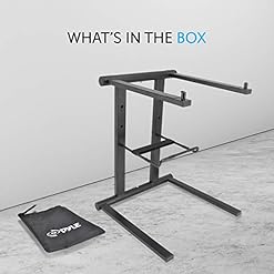 The Pyle Universal Portable Foldable Professional DJ Laptop Stand with Second Accessory Tray This Stand Will Securely and Dependably Hold All Sizes of Laptop, iPad and Tablets Convenient Accessory Tray Holds a Sound Card, Hard Drives, Small Mixer and Any Other Device Light Weight Sturdy Unit Folds Flat to be Convenient and Portable Unit Fits in Backpack or Handy Carrying Bag Included Manufactured for Use in Home, Studio or on the Road Double Peg Holding Tray Keeps Laptop Secure in Demanding Environments Just Slide in the Sturdy Steel Rod Accessory Tray and Ready to Use Folding Instructions Included Weight of Unit: 3.3 lbs. Dimensions Folded: 10.2” x 9.8” x 1.2” inch Dimensions Unfolded: 10.2” x 9.8” x 13.7” inch Laptop Shelf Dimensions: 9.6” x 8.5” inch.
