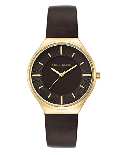 Domed mineral crystal lens Glossy dark brown inner zone with gold-tone hands; dark brown patterned outer zone with gold-tone markers Dark brown leather strap with buckle closure