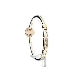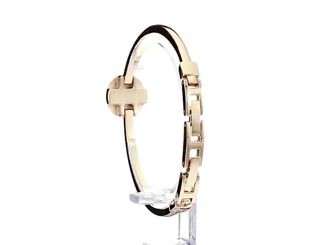 Slightly domed mineral crystal lens; blush pink glossy dial with gold-tone hands and markers; gold-tone bangle with adjustable end links; jewelry clasp and extender