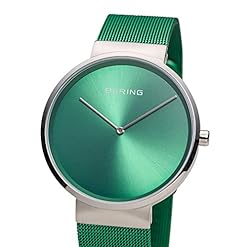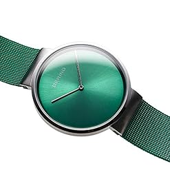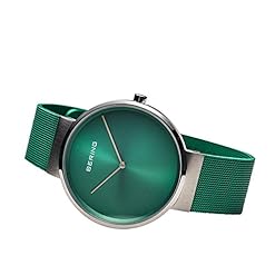The BERING watch has a highly scratch-resistant and flat sapphire crystal covering the green sunray dial