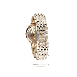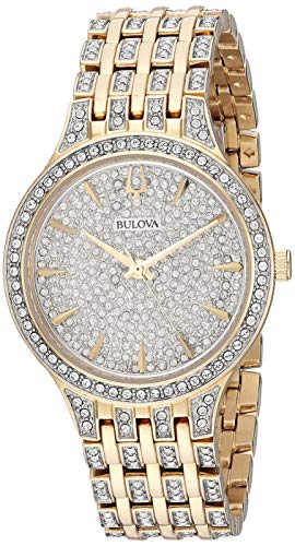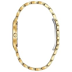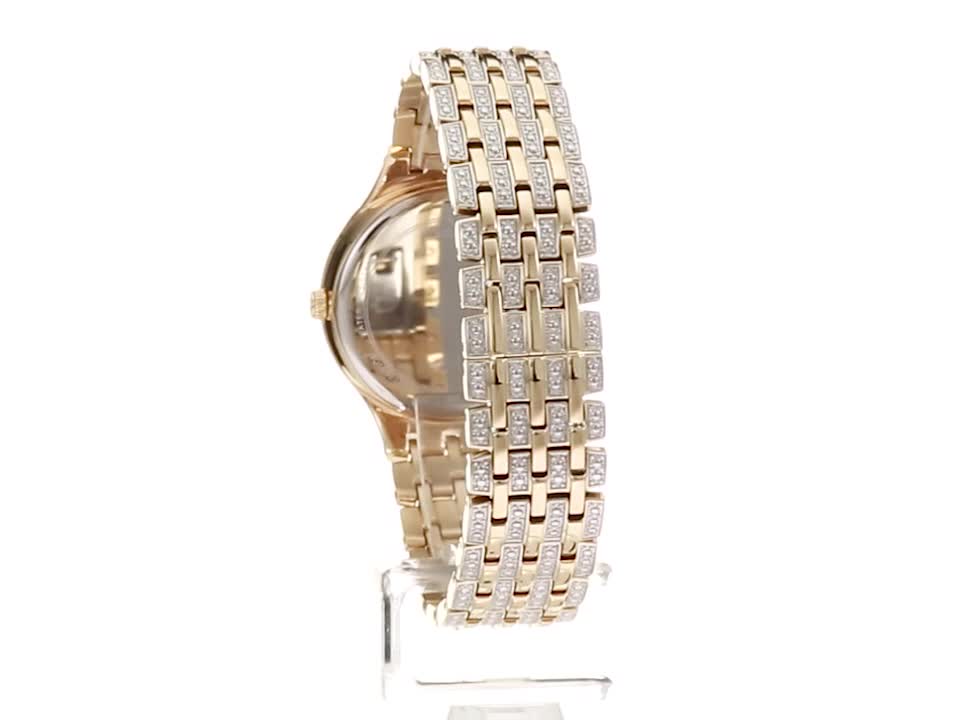 New slim and sleek style embellished with 440 Swarovski Crystals. Gold and silver tone stainless steel case and bracelet and clear pave dial. Watch features a flat mineral crystal, quartz movement, and water resistance to 30 meters. Diameter: 32mm Thickness: 6. 9mm