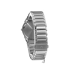 Bulova Men’s Bracelet Calendar Watch is the epitome of quiet luxury. Silver-tone stainless steel construction offers both durability and cool elegance, making this dress watch both distinctive and versatile. Quartz movement ensures precision and reliability, while silver-tone hands and bar markers on a streamlined sunray silver dial look sleek and sophisticated. There’s also a date display at three o’clock, and a polished bracelet band with fold-over clasp with push-button safety for secure wear. Water resistant to 99 feet, this Bulova original is both shock-resistant and anti-magnetic, includes a scratch-resistant crystal, and has a clean, classic aesthetic appeal that’s ideal for work or dress wear.