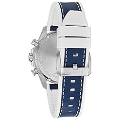 Watch Sizing Guide Add a new depth to your look with the Marine Star Bulova® timepiece. Stainless steel case. Leather strap with adjustable buckle closure. Round face. Three-hand analog display with quartz movement. Blue dial features silver-tone hands and hour markers, three subdials, minute track, date display window, and Bulova detailing. Chronograph functionality. Water resistant up to 330 feet. Imported. Your Bulova watch is covered by Bulova’s 3-Year Global Warranty. Measurements: Case Height: 43 1⁄2 mm Case Width: 43 1⁄2 mm Case Depth: 11 4⁄5 mm Band Width: 21 2⁄5 mm Band Circumference/Length: 9 1⁄2 in Weight: 3.6 oz