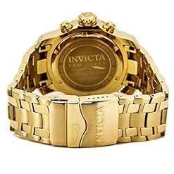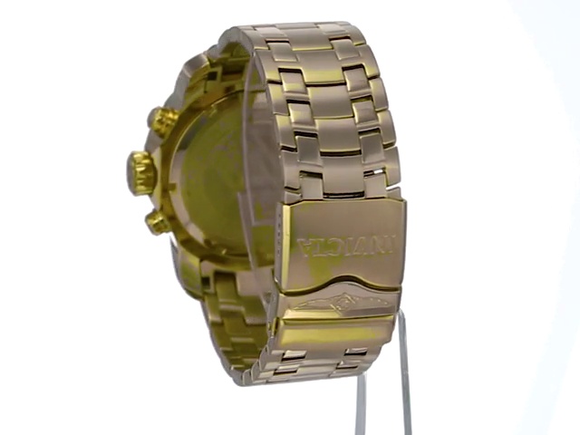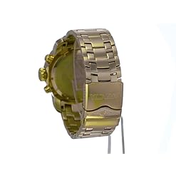 Classic chronograph styling with contemporary features, the Invicta Men’s Pro Diver Collection Chronograph 18k Gold-Plated Watch features a brushed and polished 18k gold-plated stainless steel case and a band that closes with a fold-over safety clasp. The stainless steel case provides an ideal foundation for this watch’s rotating bezel with minute markers and its attractive black dial. The dial has luminous hands and hour markers, and three subdials at the two, six, and 10 o’clock position. There’s also a magnified date window at the four o’clock position to help you keep tabs on your busy schedule. For added style, Invicta included a large crown and two bold buttons on the right-hand side of the case. Other features include precise Swiss quartz movement, a durable flame-fusion crystal, and water resistance to 660 feet (200 meters).