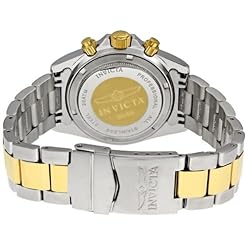 Exude confidence and elegance with this analog quartz Cougar Chronograph watch from Invicta’s Speedway Collection. It features new, 23 karat special Invicta gold plating on gold-tone, solid stainless steel. The blue dial, with an anti-reflective mineral crystal, features this gold plating along with three additional sub-dials, Tritnite luminous hands and markers, and a date calendar. The 20-millimeter band with a fold-over-clasp-with-safety has a center stripe of gold plating; the stationary bezel, with tachymeter, is gold plated as well. Large gold-plated, triple-screw-down crown and pushers make accurate adjustments easy. It is water resistant to 660 feet and is backed by a 1-year manufacturer’s warranty.