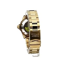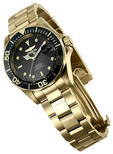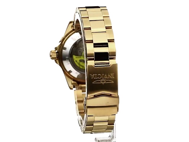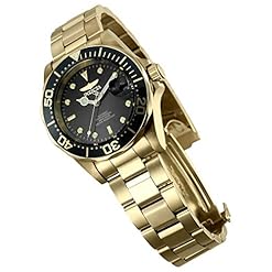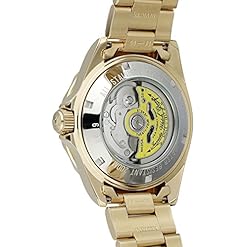 With the affordable gold-tone Invicta Pro Diver G3 automatic men’s watch, you can still afford to buy flippers and a pair of goggles. It features a shock-resistant, 21-jewel automatic movement that will stand up to the rigors of your undersea adventures, and it’s water resistant to 200 meters (660 feet). The watch case and stainless steel bracelet band are both plated with 23 karat yellow gold, and mix brushed and polished finishes. The black dial includes large Tritnite luminous markers and hands (with seconds hand) and a date window at 3 o’clock with a magnifier. Other features include a black-plated unidirectional rotating bezel with elapsed time markings, diver’s buckle with safety clasp, and an anti-reflective mineral crystal.