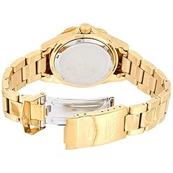 Providing a nostalgic nod to the classic nautical timepiece, the gold-tone Invicta Pro Diver stainless steel men’s watch features gold plating and water resistance to 200 meters (660 feet). The round gold-tone stainless steel watch case measures 40mm (1.57 inches) wide and has a blue unidirectional rotating bezel with gold elapsed time markings. It has a blue dial background with large luminous Tritnite hands (with seconds hand) and dotted dial markers. The gold-tone stainless steel bracelet band mixes brushed and polished links, and it’s joined by a fold-over-clasp-with-safety. Other features include a scratch-resistant mineral crystal with anti-reflective coating and a date function at 3 o’clock.