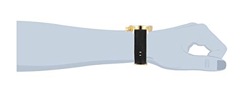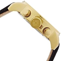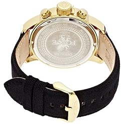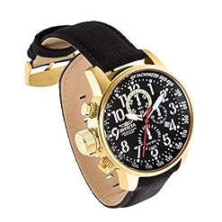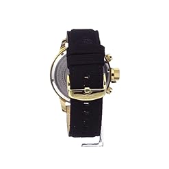 Black dial enhanced by luminous black hands. 18kt Gold-tone stainless steel case with a black cloth with leather backing band. Quartz movement. 100 meters / 330 feet water resistance. Fixed bezel. Scratch Resistant Mineral crystal. Solid caseback. Tang clasp. Pull / Push crown. Case size 46 mm x 13 mm. Band 21 mm x 9 incheslong. Invicta 1515 Lefty Chronograph Watch.