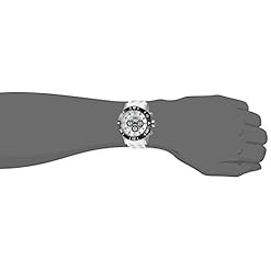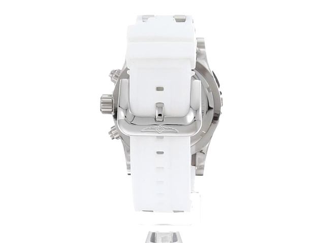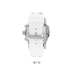 Chronograph with 60sec, 60min and 24hr sub dials with date display, white rubber with stainless steel accents, push crown